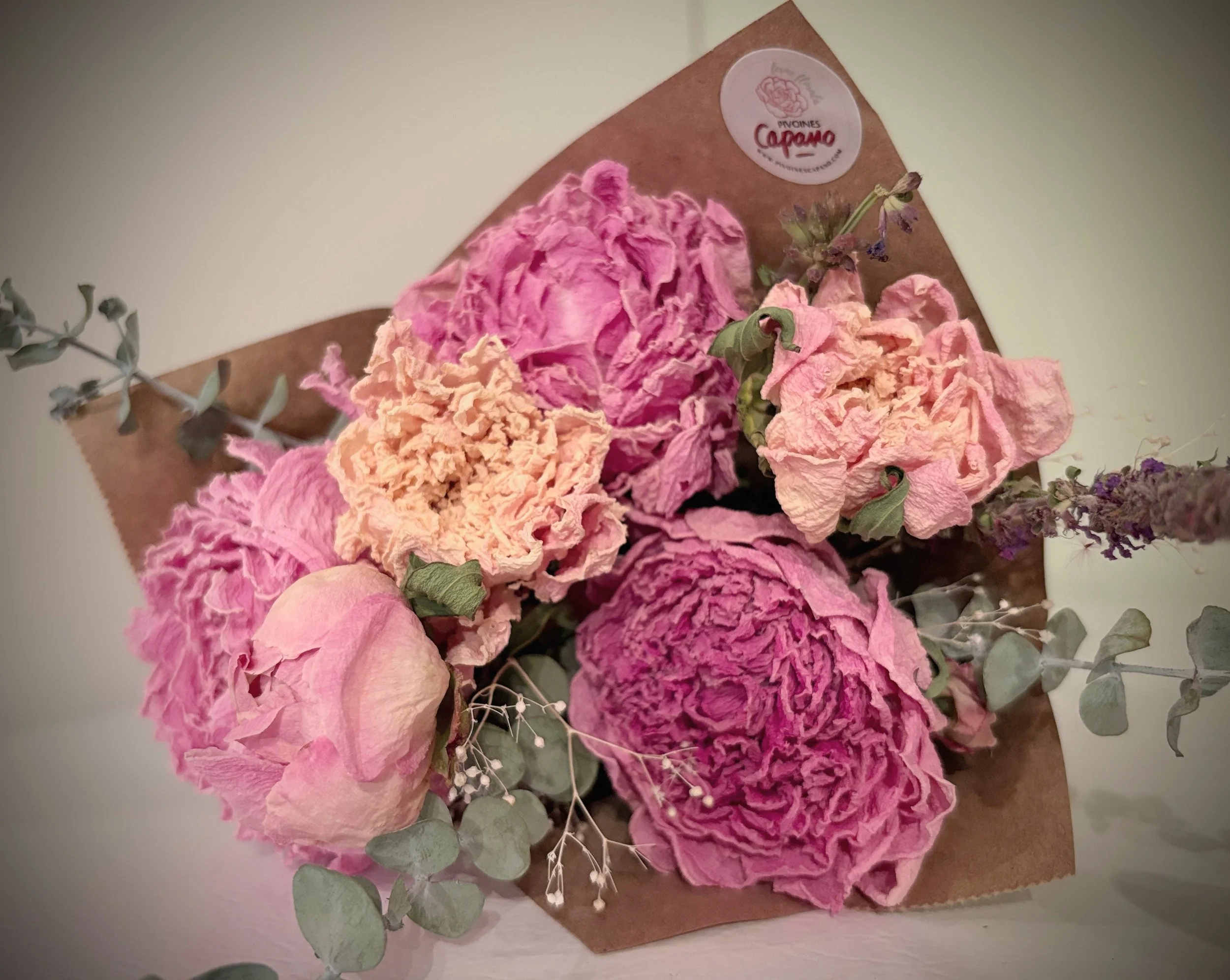 Pivoines séchées naturellement offertes en bouquet, pour les avoir avec nous toute l’année!