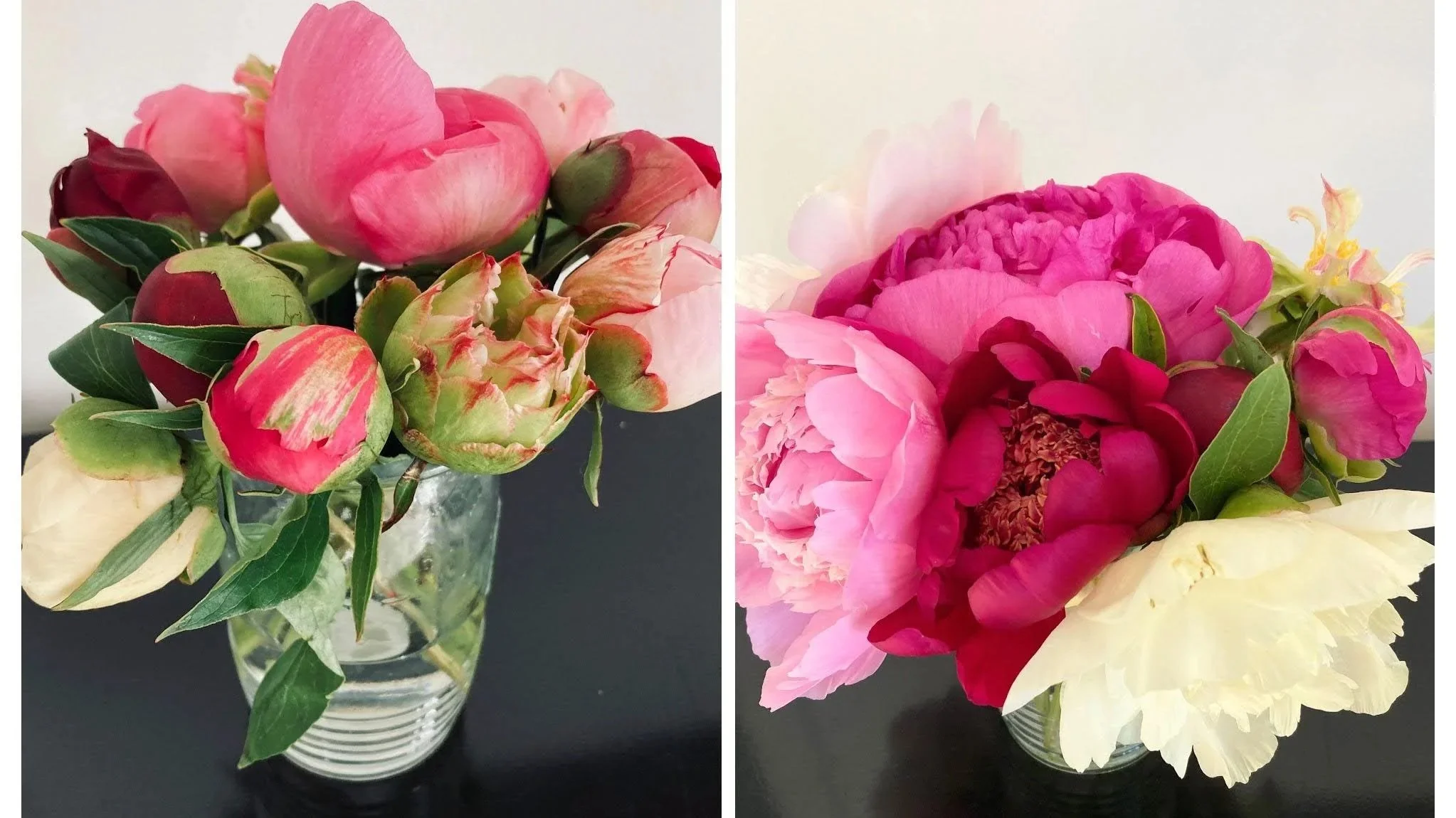 “Je cultive plusieurs centaines de variétés qui fleurissent en alternance de la fin mai jusqu’au 10 juillet. Certaines pour la production de fleurs mais plusieurs autres sont dédiées à la vente de plants pour les jardiniers-horticulteurs. Ces dernières variétés sont toutes en quantités limitées. Et souvent, sur des plants plus compacts ou encore immatures dont on ne peut récolter que des tiges courtes. Mais les fleurs sont d’une beauté exceptionnelle et pour plusieurs, avec des couleurs et des formes de fleurs non conventionnelles. Le WOW facteur… J’ai donc décidé de créer un petit bouquet en mélange selon les arrivages dans les champs pour mettre en valeur toutes ces belles fleurs. Et permettre à tous de découvrir la diversité du monde des pivoines.” - Mano Capano