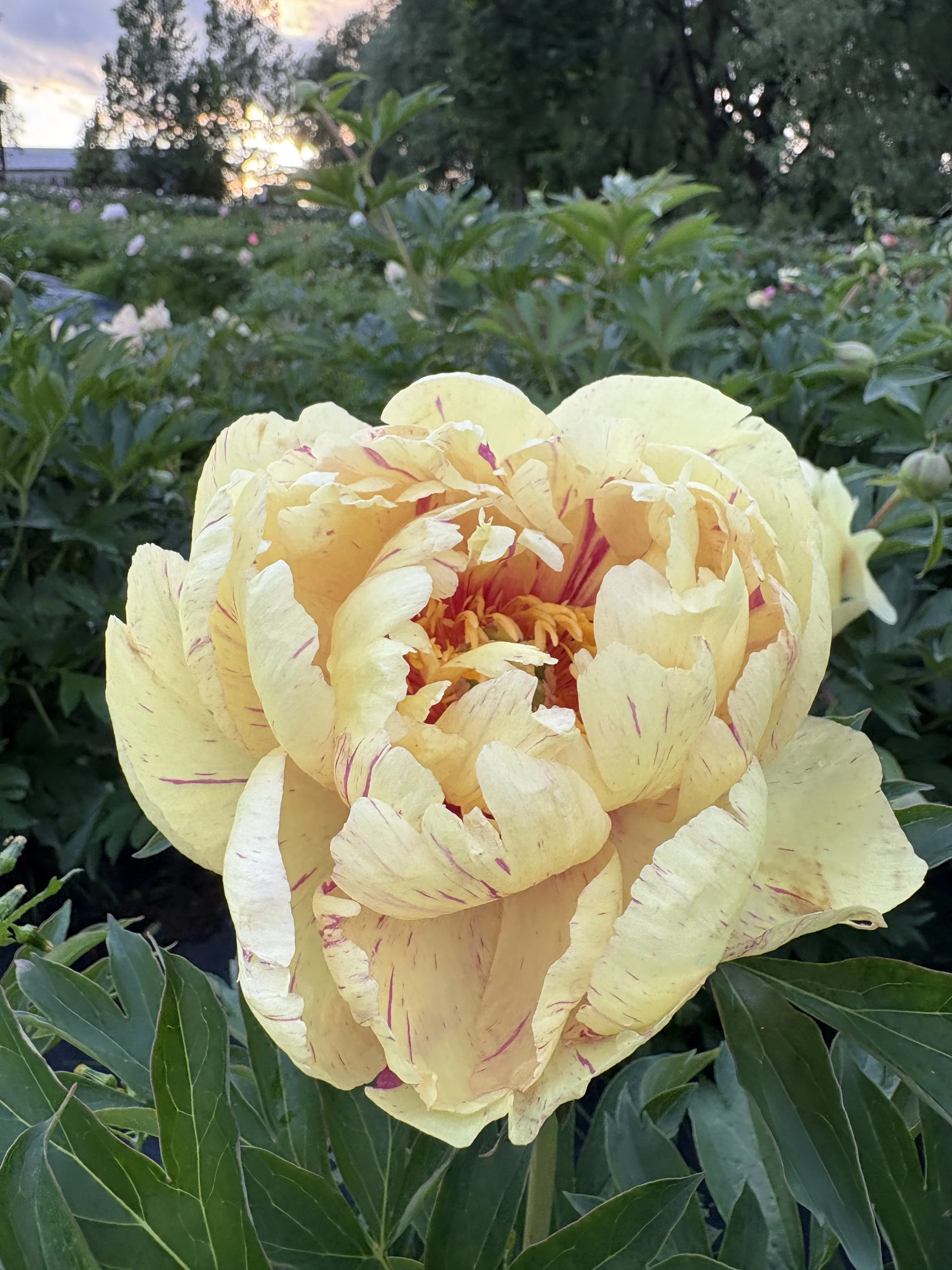 Rare! Larges fleurs jaunes semi-doubles avec une caractéristique très spéciale: les fleurs sont jaunes avec des stries mauves sur certains pétales. Une originalité qui plait particulièrement à Danaé! Il peut même arriver qu’une fleur apparaisse avec une moitié jaune et l’autre rose! Conservez votre appareil photo à proximité! Les fleurs sont portées par des tiges robustes, bien au-dessus du feuillage. Excellente pour le jardin ou les fleurs coupées. Grand plant atteignant 120 cm. Floraison en mi-saison et parfois même en juillet. 💛